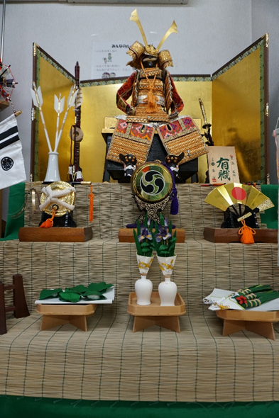 共有スペースに飾ってある兜と一緒に写真を撮るなど親子で行事を楽しむ様子が見られました。